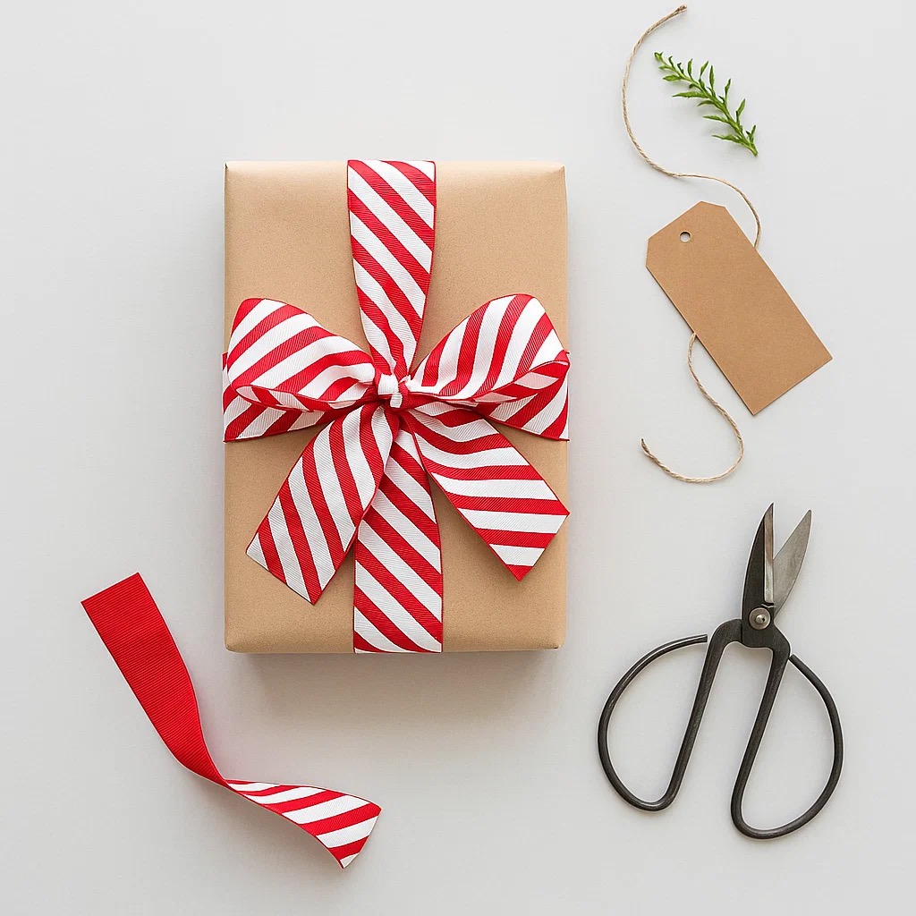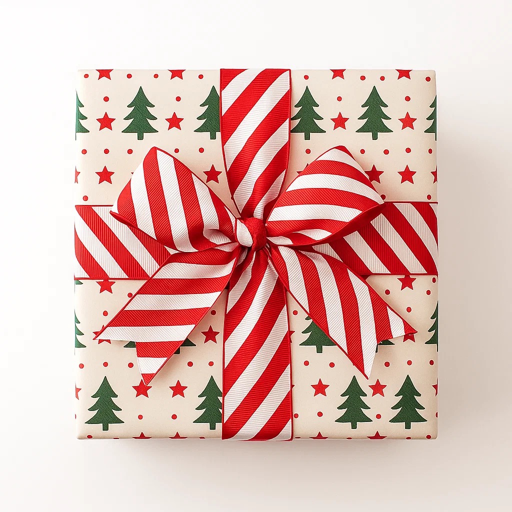 Candy-cane boldness, craft-friendly performance. GIDDY SQUARE candy stripe grosgrain ribbon pairs a crisp ribbed weave with a soft, non‑wired edge that’s easy to sew and perfect for tying neat bows. Woven selvedge resists fray; simply heat‑seal cut ends for a clean finish. Ideal for Christmas gift wrap, hampers, wreaths and bunting, plus card‑making, tags, hair bows and trims. Supplied in one continuous length wherever possible.