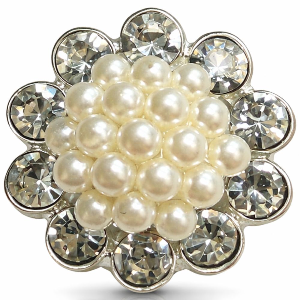 Sparkling 19mm Diamante Pearl Cluster Shank Button – Elegant Crystal Jewel Embellishment. Add a touch of timeless, regal sophistication to your projects with this exquisite 19mm Diamante Pearl Cluster Button. Designed to exude luxury, this statement piece features a dense central cluster of lustrous creamy pearls framed by a radiant halo of high-clarity crystal diamantes. The polished silver-tone base enhances the brilliance of the stones, creating a "jewelry-grade" finish that serves as a stunning focal point for any garment. Expertly constructed from a premium blend of 80% alloy metal, 10% crystal, and 10% pearl, this button offers a substantial, high-quality feel. Its versatile 19mm size makes it an ideal choice for refreshing formal blazers, bridal wear, evening cardigans, or adding a sophisticated touch to handmade accessories and creative craft projects. The sturdy shank-back loop on the reverse ensures a seamless, professional attachment, allowing the decorative cluster to sit perfectly flush against the fabric without visible thread holes. To maintain the pristine clarity of the crystals and the smooth finish of the pearls, this delicate embellishment is handwash only. Pack of 1 button.