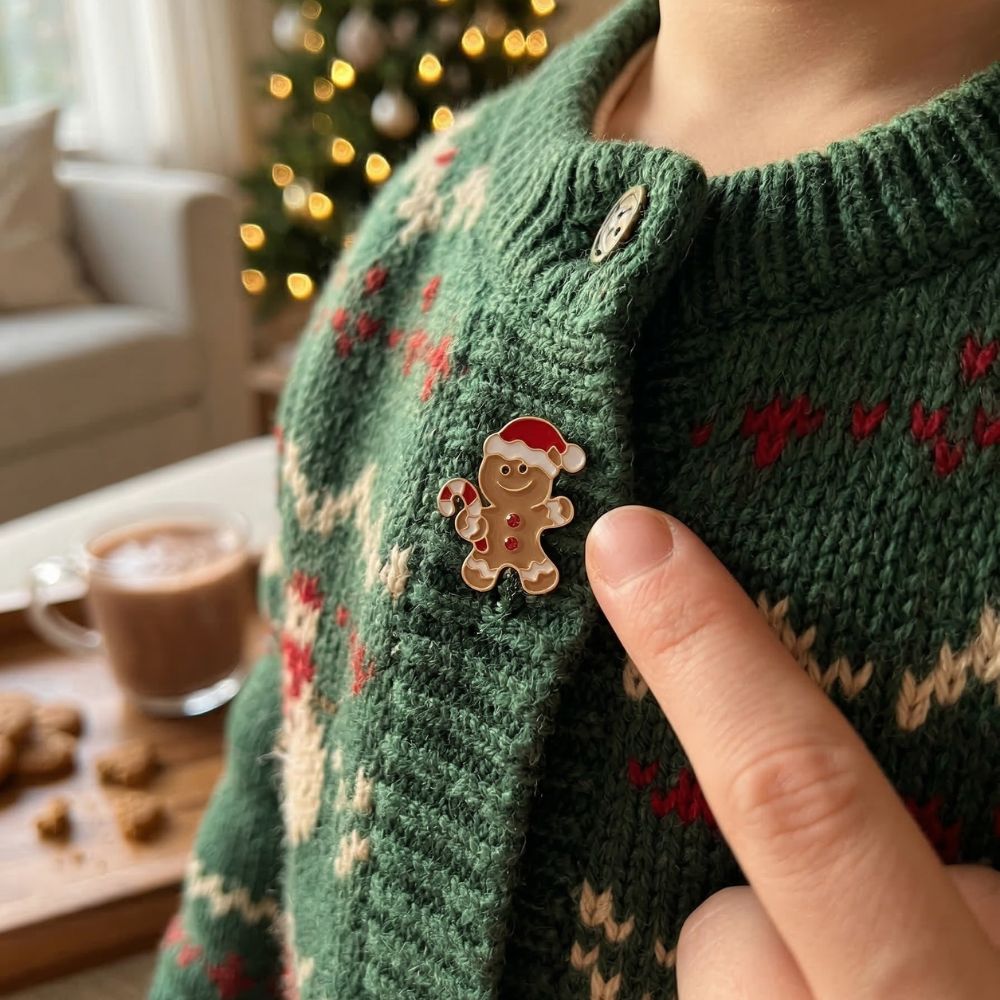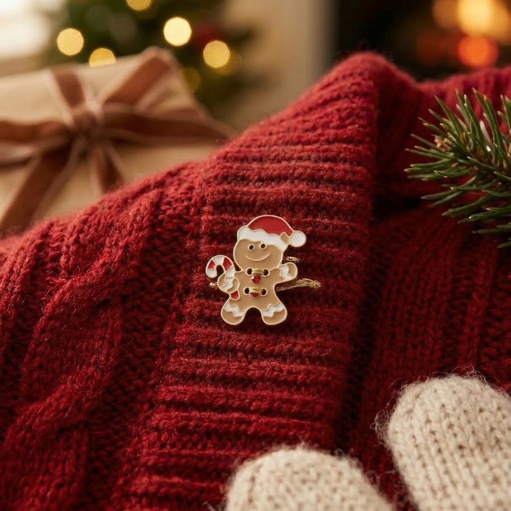 • Festive Gingerbread Design: Features a whimsical gingerbread man shape crafted on a gold base with vibrant enamel detailing and sparkling red diamantes for a festive "bling" look.