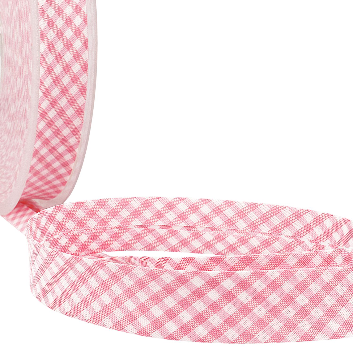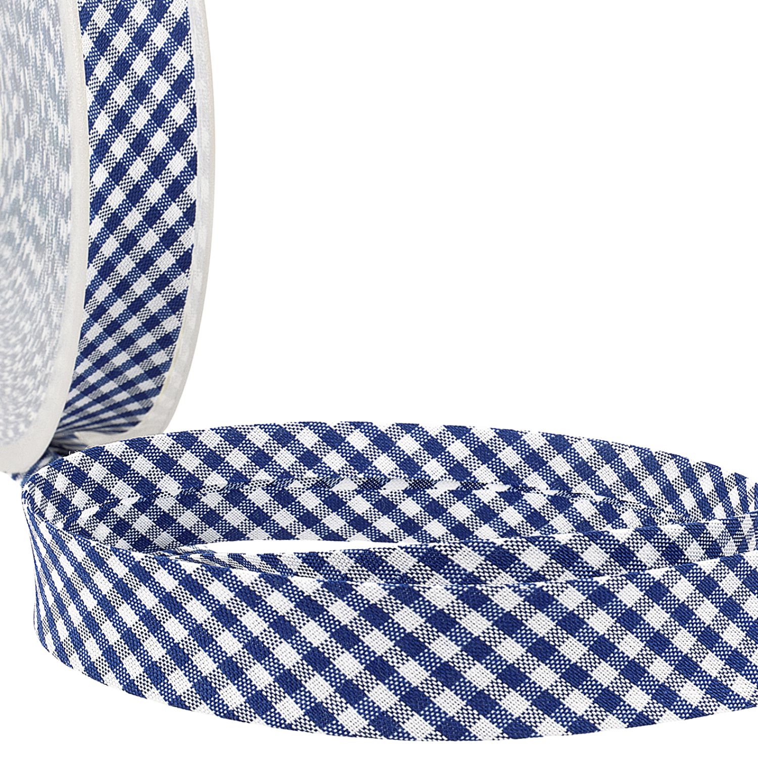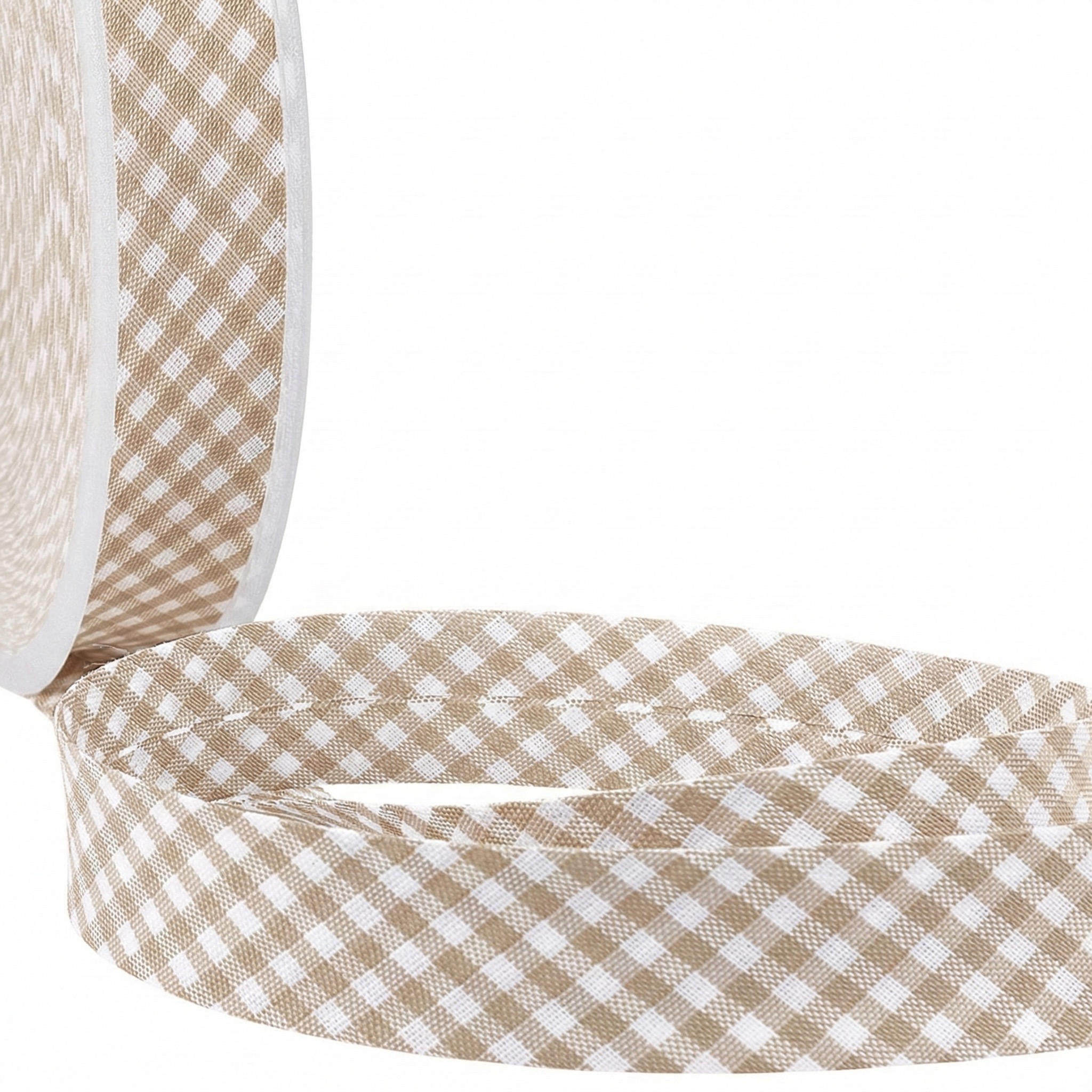 Premium yarn dyed gingham bias binding in large gingham check — available in 11 colours, two widths (20mm and 30mm) and three lengths. Made from a smooth, hardwearing 50% cotton / 50% polyester blend, with the larger gingham check woven into the fabric rather than printed, giving a crisp, long-lasting pattern that holds its colour wash after wash.