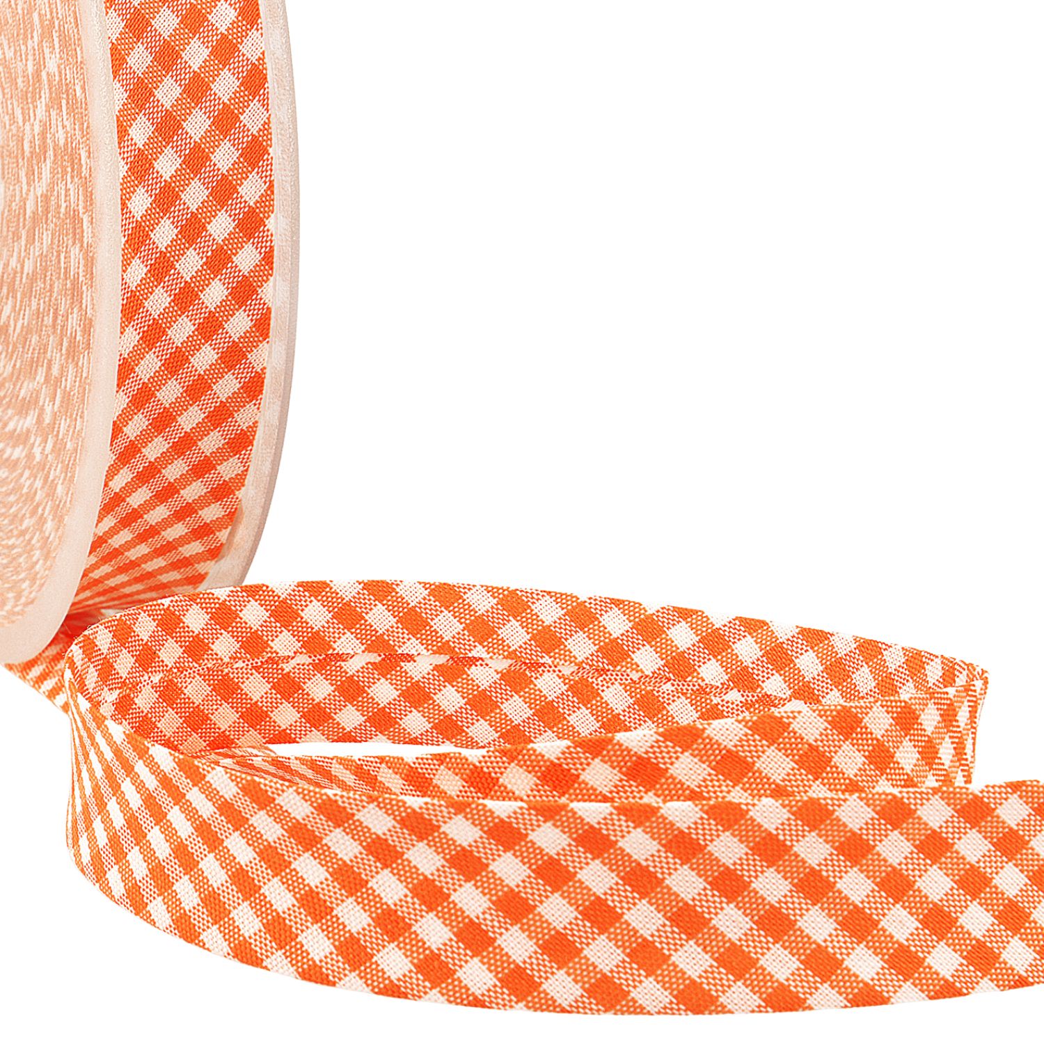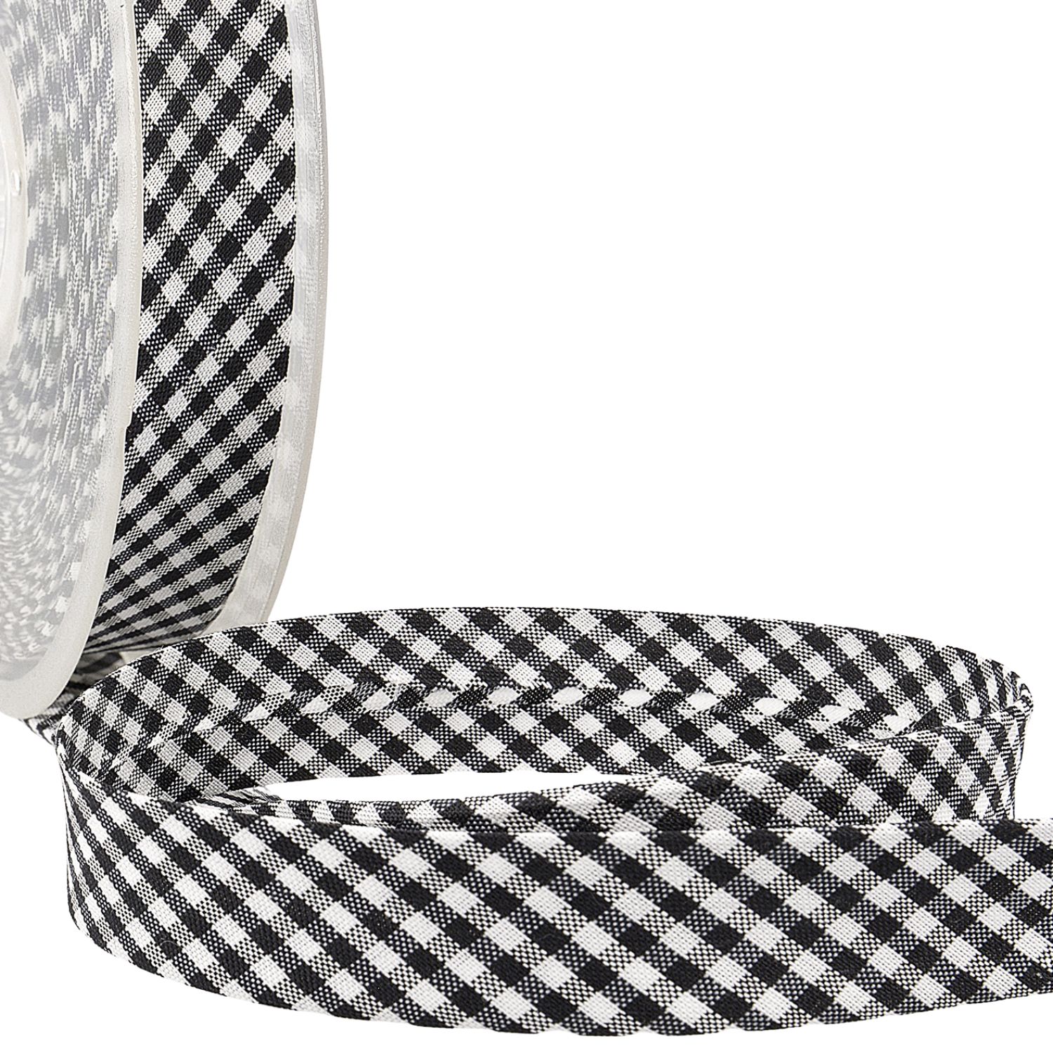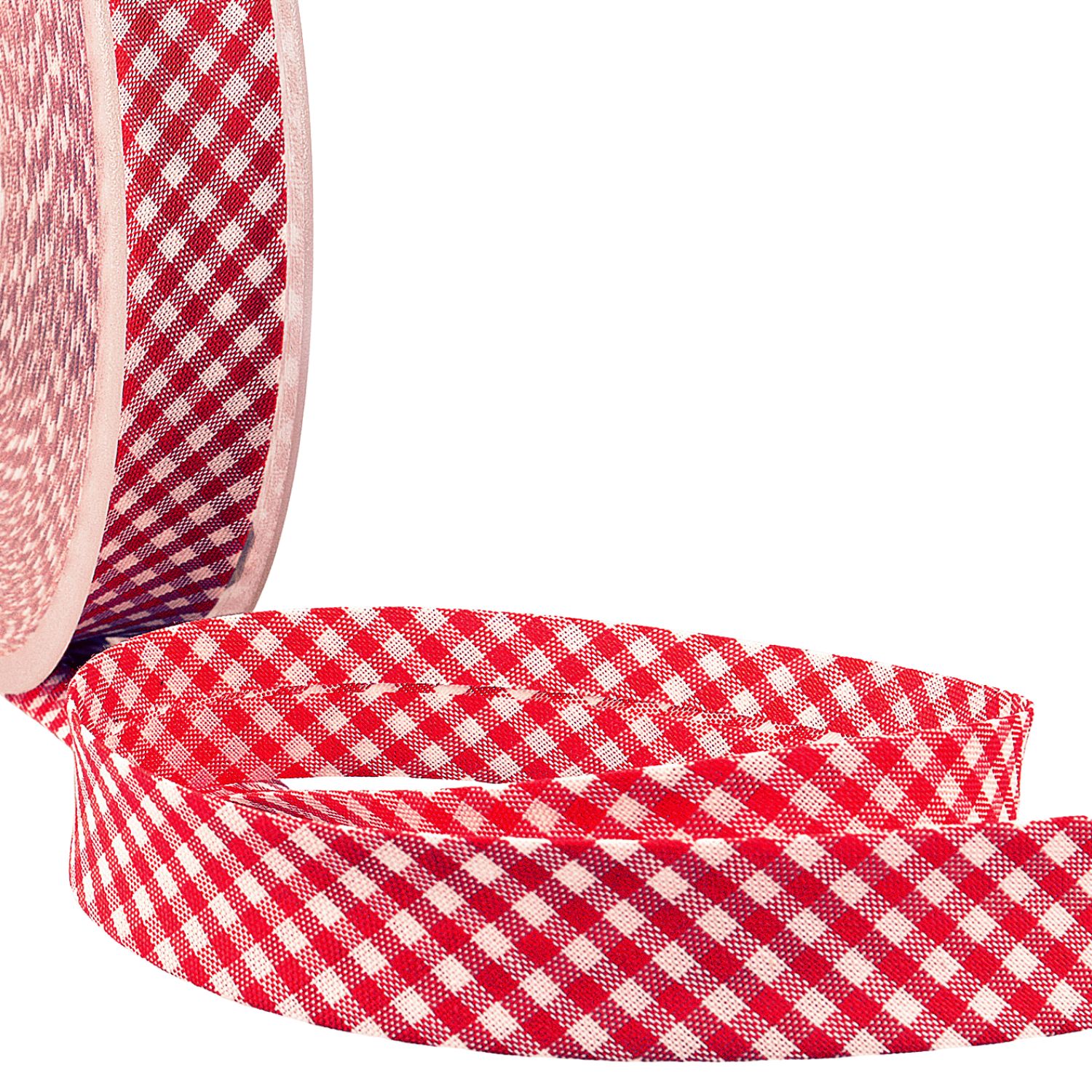 Premium yarn dyed gingham bias binding in large gingham check — available in 11 colours, two widths (20mm and 30mm) and three lengths. Made from a smooth, hardwearing 50% cotton / 50% polyester blend, with the larger gingham check woven into the fabric rather than printed, giving a crisp, long-lasting pattern that holds its colour wash after wash.