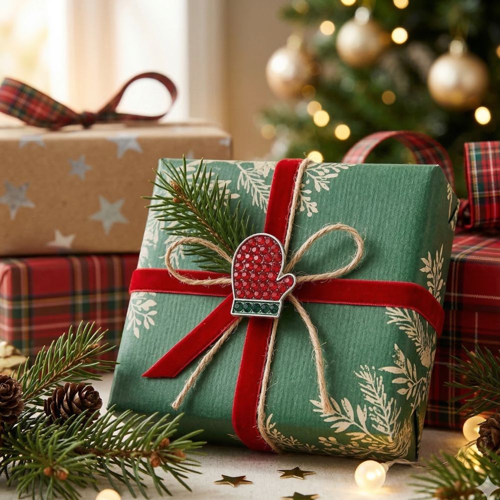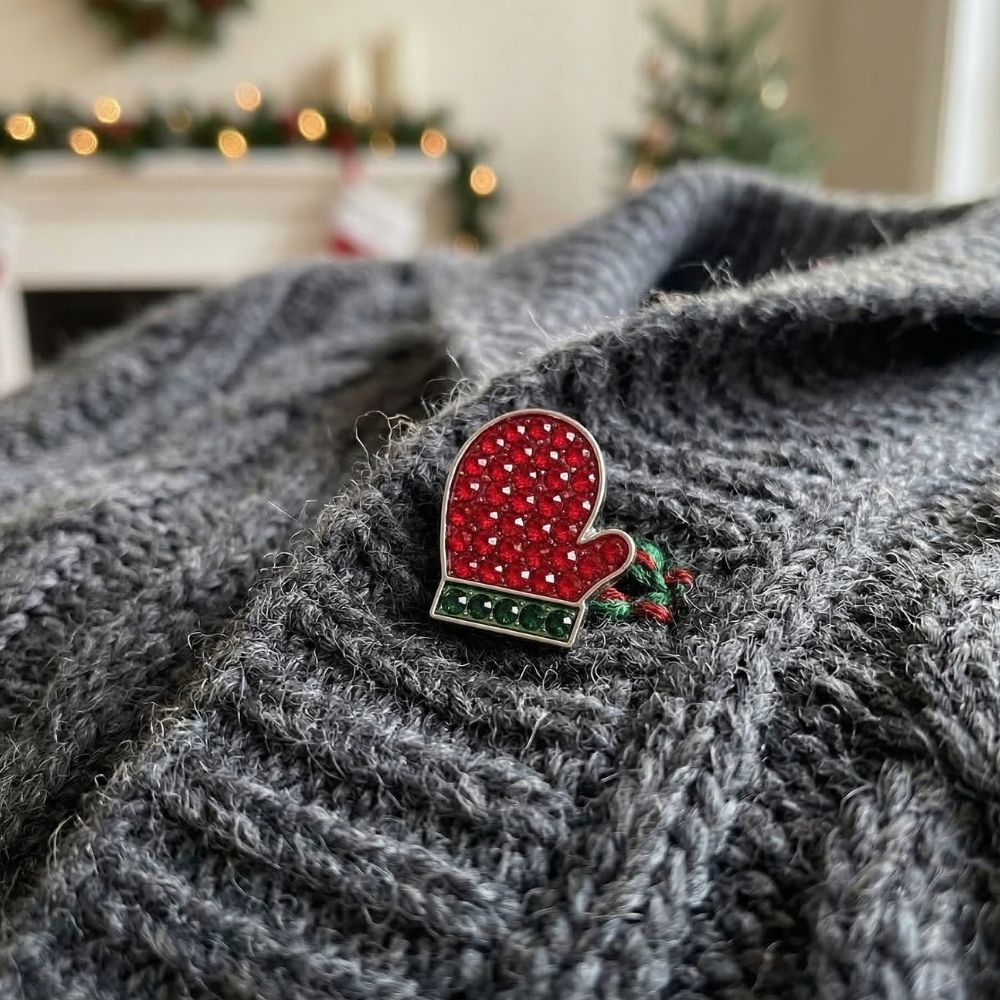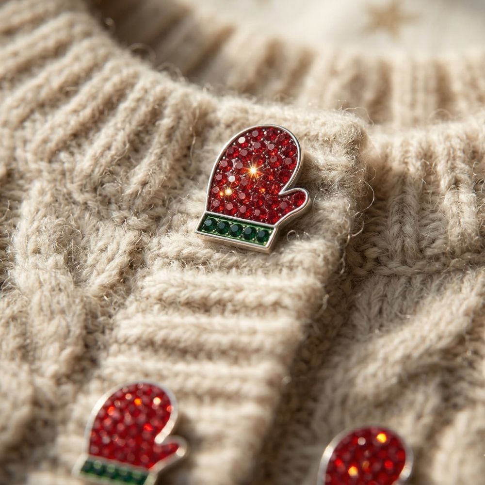 • Festive Mitten Design: Features a charming mitten silhouette on a polished silver base, beautifully accented with vibrant red and green diamantes for a classic holiday look.